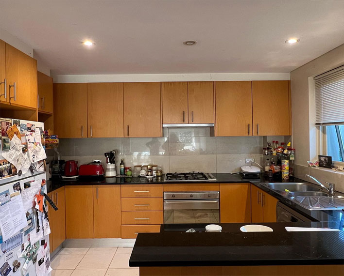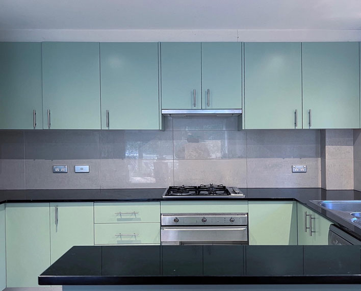 After the panels have been spray painted with the final colour and finish, the team will start unmasking the kitchen and installing back all the doors and drawers with the handles, then clean up the area, and leave you with your transformed kitchen.